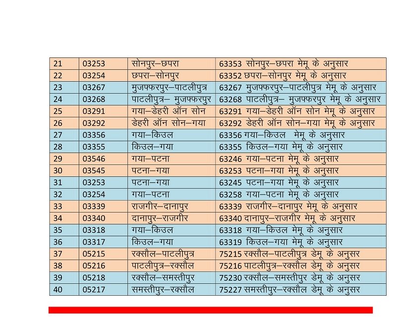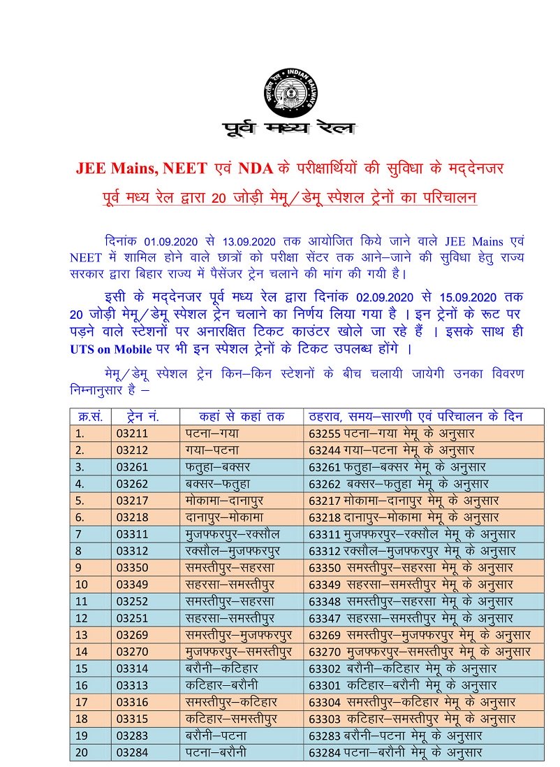 Operation of 20 pairs of MEMU / DEMU special trains by East Central Railway in view of JEE mains, NEET & NDA candidates.