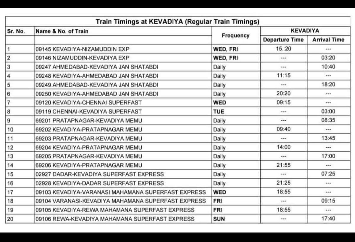 Train Timings at Kevadiya (Regular Train Timings) Train Name, Train No., Frequency Departure time, Arrival Time (For More Information Click the Below Link)