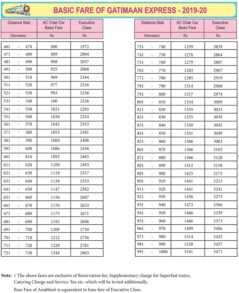 Gatimaan Express Fare Table 2025-20 Basic Fare Of Gatimaan Express 2025-20 Gatimaan Express Fare Table 2025-23 By trainnewsPosted on August 10, 2025Posted in Gatimaan Express, Railway Fare TableTagged GATIMAAN EXPRESS, gatimaan express fare, Railway Fare Chart 2019-20, railway fare chart kilometer wise 2019-20, Railway Fare Table, Railway Fare Table 2019-20, train fare chart 2019-20, train fare chart kilometer wise 2019-20, train fare table 2019-20 Post navigation Anubhuti Coaches Fare Table 2025-23Mahamana Express Fare Table 2025-23