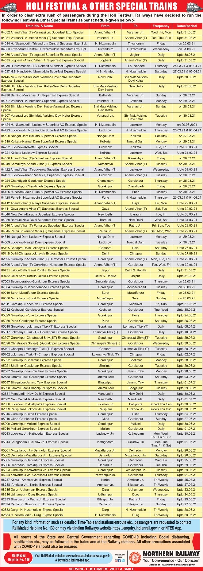 IRCTC Holi Special train 2021 Schedule, Route, Timings, Booking Date, Frequency and Fare Details Click the Below Link
