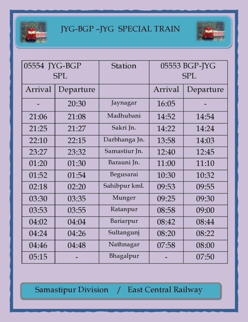 For the convenience of passengers, East Central Railway has decided to run special train Bhagalpur-Jaynagar- Bhagalpur (Train No. 05553 / 05554)