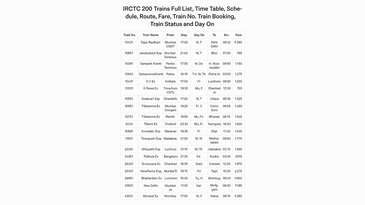 IRCTC 200 Trains Full List, Time Table, Schedule, Route, Fare, Train No. Train Booking, Train Status and Day On