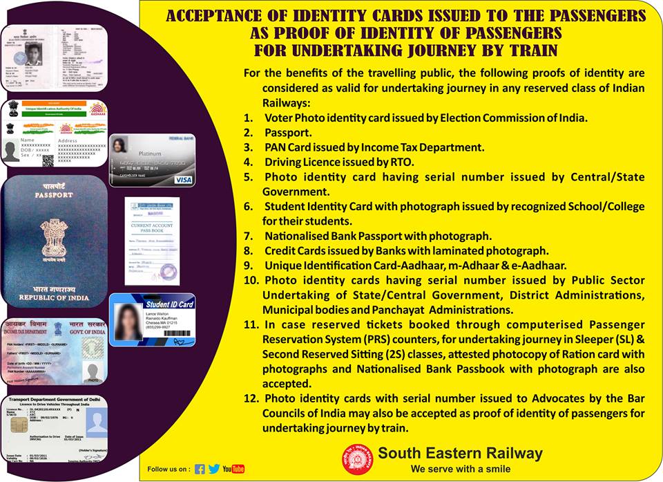 For the benefits of the travelling public, the following proofs of identity are considered as valid for undertaking journey in any reserved class of Indian Railways: