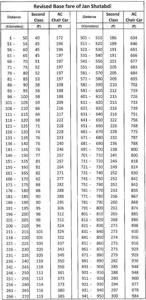 Jan Shatabdi Express Fare Chart 2025-2025 (Distance Slabs: 501-950)