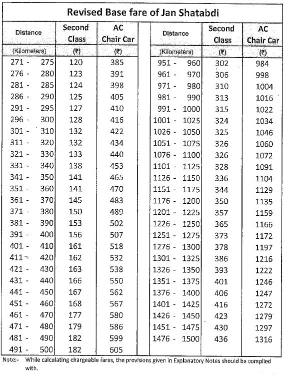 • AC Chair Car (CC) fares in Jan Shatabdi Express are classified as Mail/Express AC class, subject to a ₹0.02 per km basic fare hike.