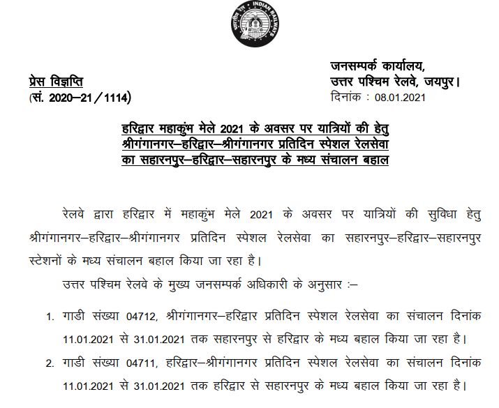 For the convenience of passengers, North Western Railway has decided to run special train between Shri Ganganagar-Haridwar-Shri Ganganagar (Train No. 04712 / 04713)