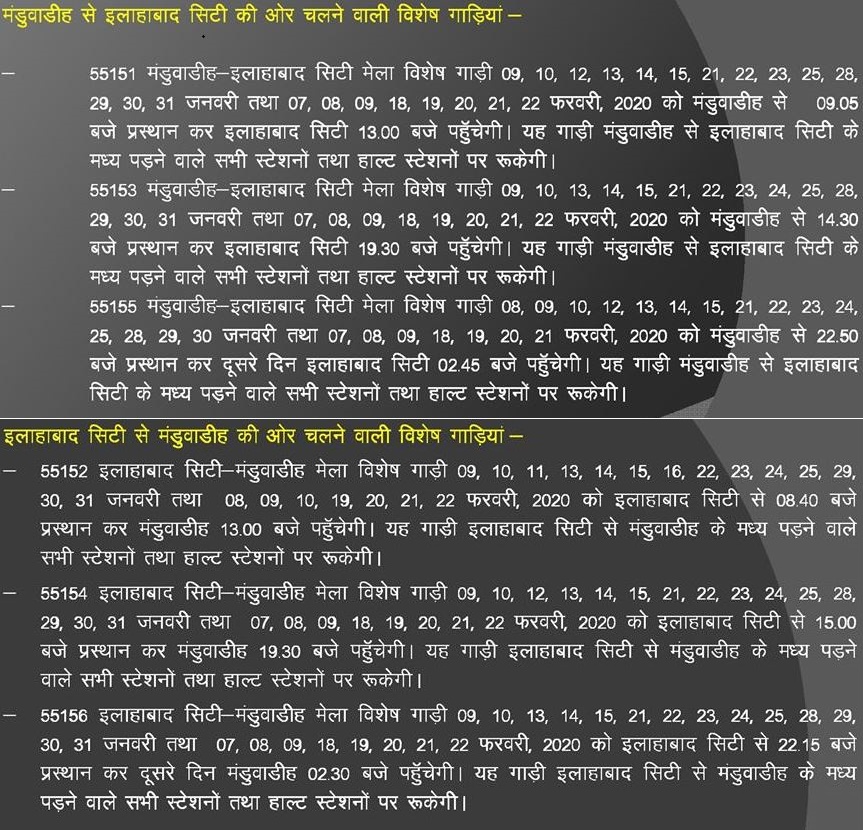 Train No.55152 Allahabad City-Manduadih fair special train 09, 10, 11, 13, 14, 15, 24, 23, 24, 29, 30, 31 January 2025. 08, 09, 10, 19, 20, 21, 22 February 2025. Departure from Allahabad city at 08.40 pm, will reach at 13.00 pm. This train will stop at all stations and halt stations in the middle of Manduadih from Allahabad city.