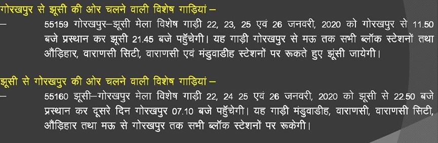 Train No. 55160 Jhusi-Gorakhpur fair special train will arrive at 07.10 pm on 22th and 26th January, 2025 at 22.50 pm on the second day at Gorakhpur
