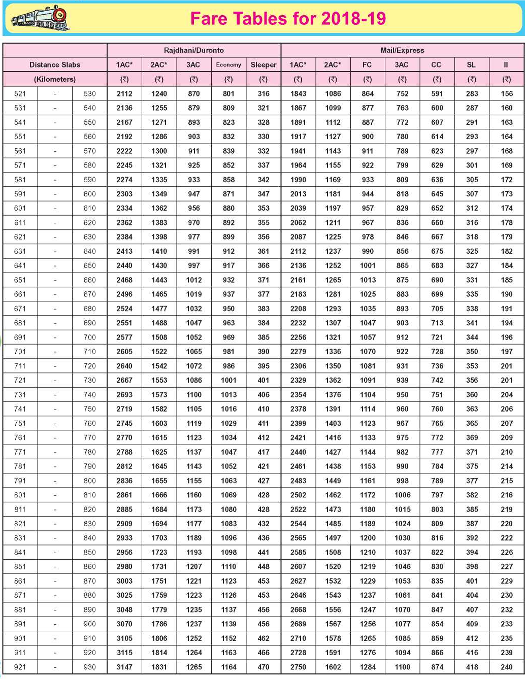 Sl. No. Mail/Express Fare Tables for 2018-19 (Kilometers Wise) Download in image file