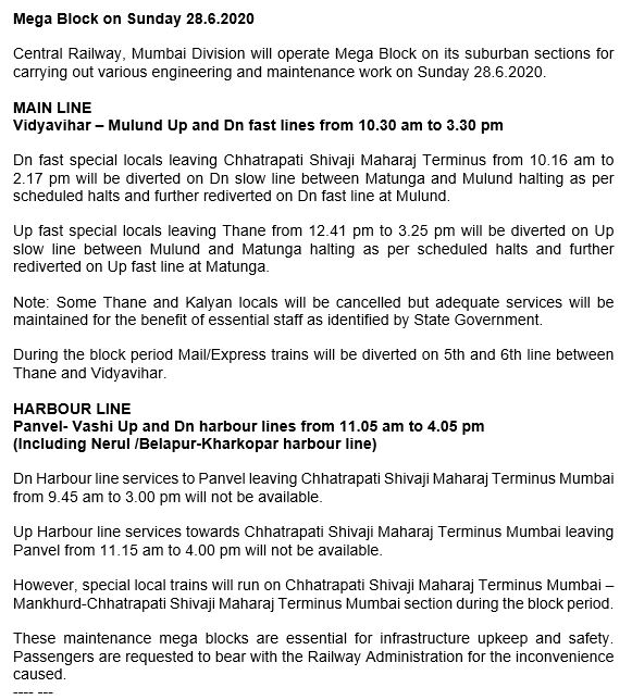 Central Railway, Mumbai Division will operate Mega Block on its suburban sections for carrying out various engineering and maintenance work on Sunday 28.6.2025.