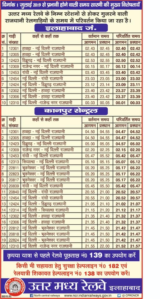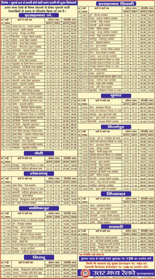Passengers may kindly note salient features of new time table effective from 01.07.19 pertaining to ALLAHABAD division. For any query related to new time table pls call 139.