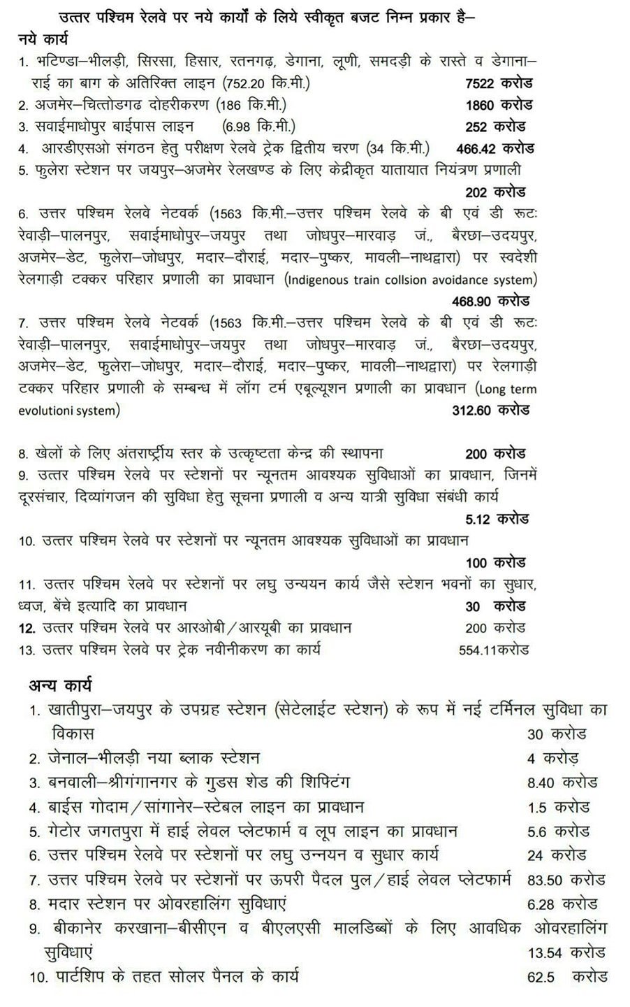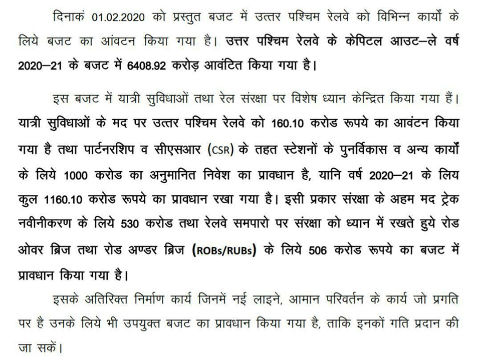 The Rail Budget 2025-21 allocated to North Western Railway has been given special attention to passenger facilities and rail safety.