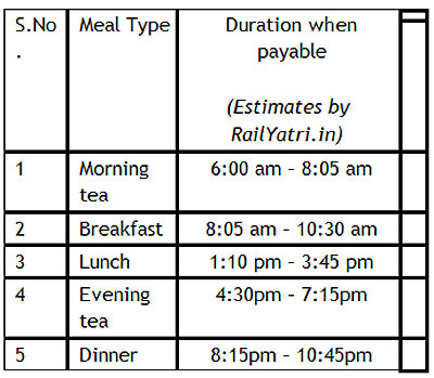 The other problem, as per RailYatri.in, is the number of meals chargeable during a journey. There is no published documentation on the time duration, during which a meal is to be served.