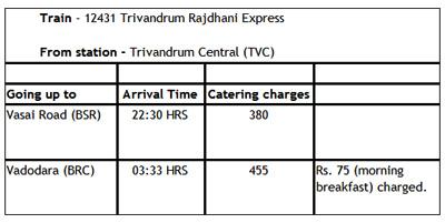 Check this out on the ticketing website – From Trivandrum (TVC) to Vasai Road (BSR), which falls just before Vadodara, the catering charges is Rs 380. However, if you check up to Vadodara this increases to Rs. 455 (due to breakfast), even though no breakfast is served between Vasai Road to Vadodara.