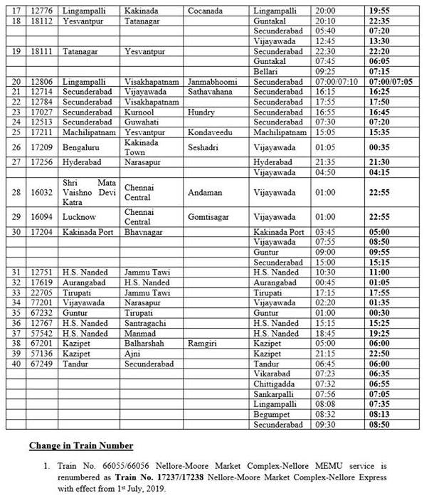 In view of new Time Table coming into effect from 1st July, 2025 the change in train timings of originating / terminating and passing through South Central Railway is detailed below for the information of passengers: –