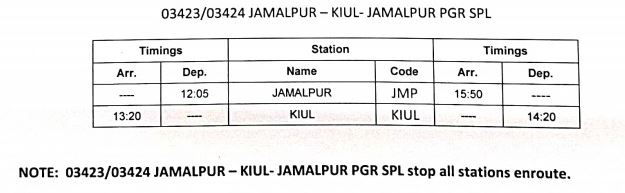 Train No. 03423 Jamalpur-Kiul passenger special train will leave from Jamalpur at 12.05 hrs & will reach Kiul at 13.20 hrs