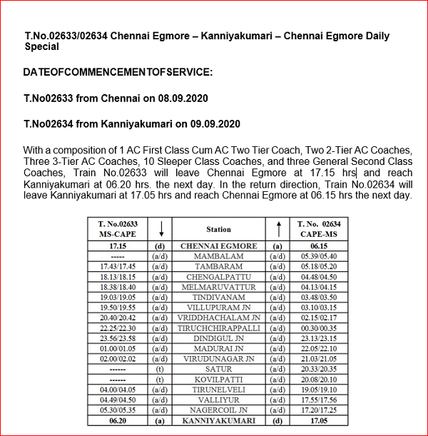 Here’s the most up-to-date verified information for the Chennai Egmore → Kanniyakumari Special (Train Nos. 02633 / 02634), introduced as a COV‑Reserved Special by Southern Railways: