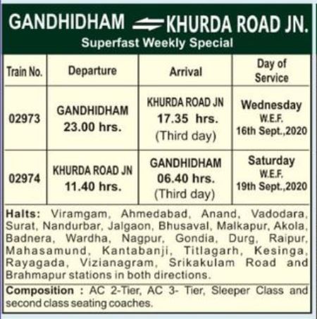 Train No. 02973 Gandhidham – Puri Special train will leave Gandhidham every Wednesday at 23.00 hrs, halt at Khurda Road at 17.35 hrs and will now reach Puri on Friday at 19.00 hrs.