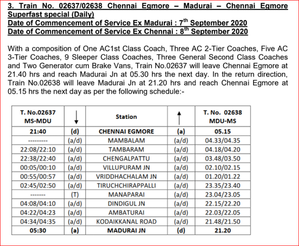 Special train between Madurai – Chennai Egmore (Train No. 02637/02638) time table, route, frequency and fare