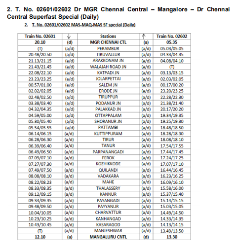 Special train between MGR Chennai Central-Mangaluru Central (Train No 02601/ 02602) time table, route, frequency and fare