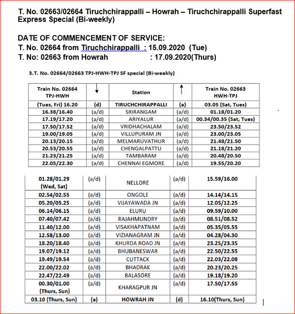 Trichy-Howrah (Train No. 02664) will leave Trichy at 4.20 pm on Tuesdays and Fridays and reach Howrah at 3.10 am on Thursdays and Sundays.