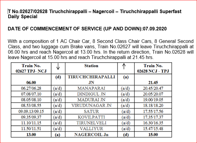 Train No.02627/02628 Tiruchchirappalli – Nagercoil – Tiruchchirappalli Superfast Daily Special
