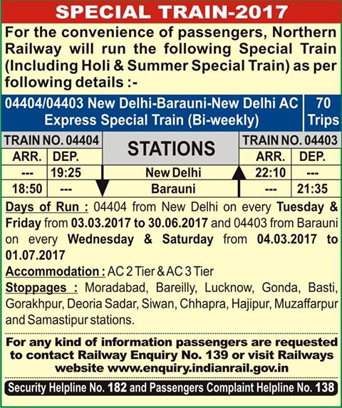 Special Trains 2017 : New Delhi – Barauni – New Delhi