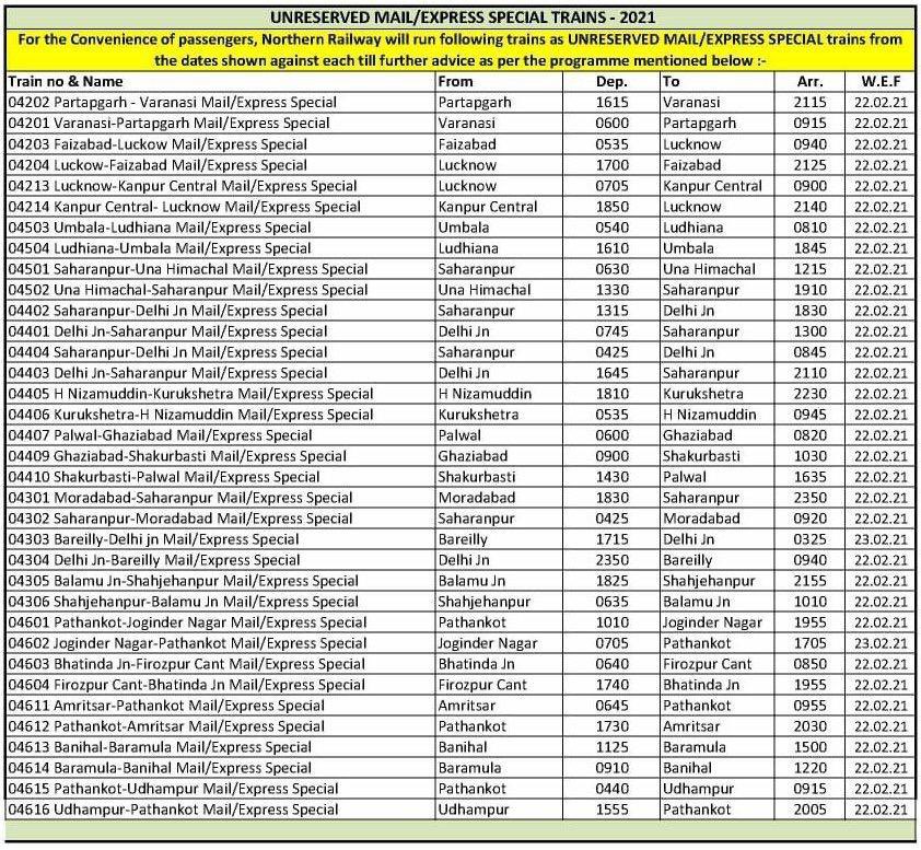 For the Convenience of passengers, Northern Railway will run following trains as Unreserved Mail / Express Special Trains from the dates shown against each till further advice as per the programme mentioned below:-