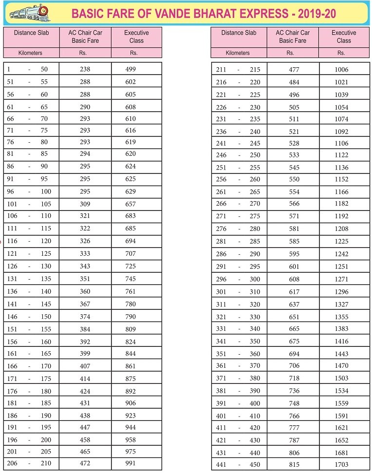 Vande Bharat Express Fare Table 2025-20 Basic Fare Of Vande Bharat Express 2025-20 Vande Bharat Express Fare Table 2025-23 By trainnewsPosted on August 10, 2025Posted in Railway Fare Table, Vande Bharat ExpressTagged Railway Fare Chart 2019-20, railway fare chart kilometer wise 2019-20, Railway Fare Table, Railway Fare Table 2019-20, train fare chart 2019-20, train fare chart kilometer wise 2019-20, train fare table 2019-20, Vande Bharat Express Post navigation SPECIAL TRAINS (380 Trips) are announced by Northern Railway From 01.10.2025 to 30.11.2025Ajmer Division New Time Table form 01-10-15 – NORTH WESTERN RAILWAY
